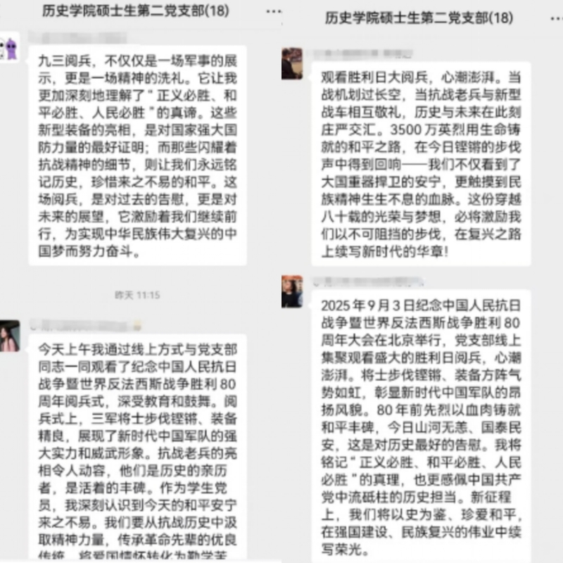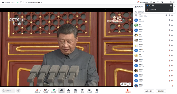 2025年9月3日9时,纪念中国人民抗日战争暨世界反法西斯战争胜利80周年大会隆重举行。av片 硕士生第二党支部全体成员通过腾讯会议的方式线上集体收看直播。在工位、在教室、在宿舍、在图书馆,虽然硕士生第二党支部的同学们或因实习事务、或因学业繁忙而难以齐聚一堂,共享一方物理空间。但在网络的连接中,大家共同沉浸于这一场气势恢宏、意义深远的爱国主义教育盛宴,感受着炽热而深沉的家国情怀。