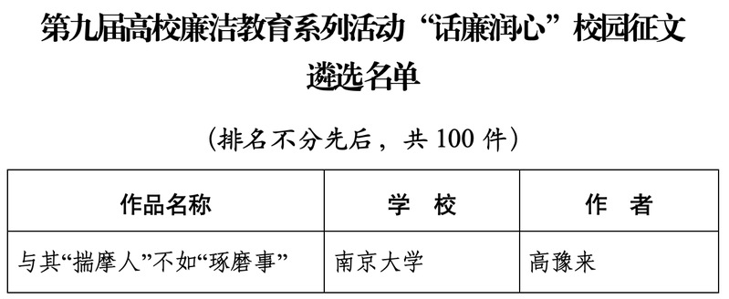 近日,在教育部第九届高校廉洁教育系列活动中,av片 2022级中国史硕士生高豫来作品《与其“揣摩人”不如“琢磨事”》入选“话廉润心”校园征文全国百强遴选名单。