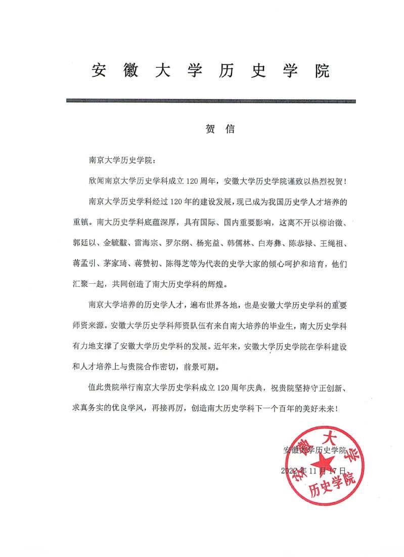 安徽大学av片 来信祝贺av片 历史学科成立120周年