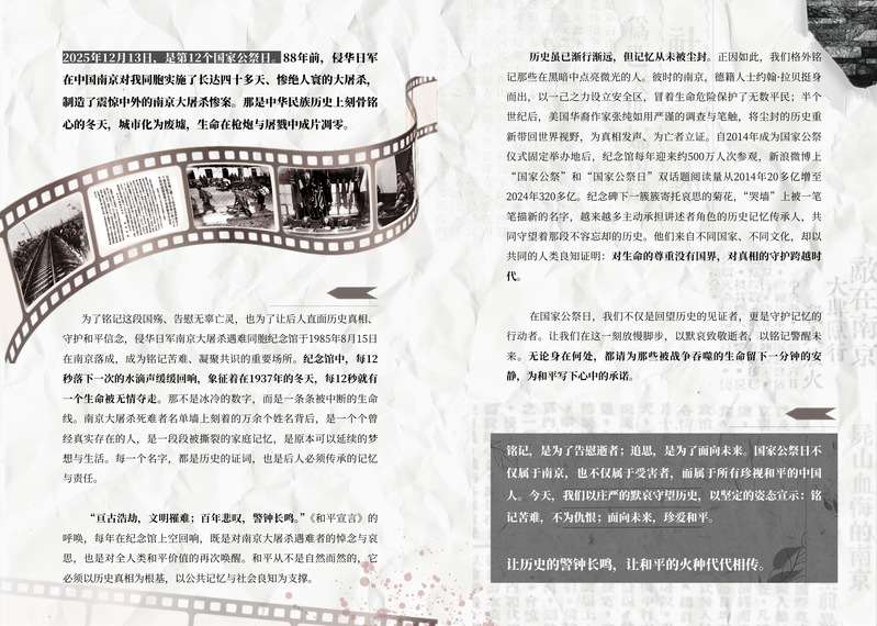 纪念碑上沉痛的数字、承载着记忆的旧照片、文字如血泣的报纸......手册内容记录着后人是如何纪念这段惨痛的历史,也提醒着我们国家公祭日不仅属于南京,也不仅属于受害者,而属于所有珍视和平的中国人,我们应当以历史真相为根基,尊重每一个生命。