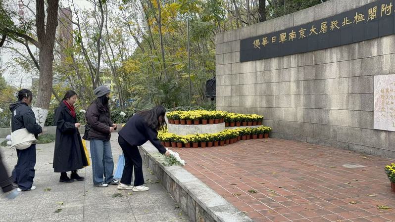 近四点,同学们来到了活动的终点北极阁丛葬地纪念碑。在纪念碑前,硕士生第三团支部代表陈馨茗同学回顾了那段民族苦难史,并号召同学们自觉肩负起传承历史真相、弘扬民族精神的责任。同学们依次献上手中的白菊,并集体默哀三分钟。