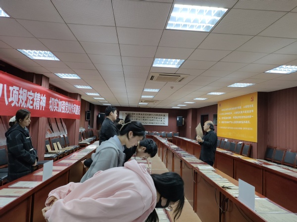 4月3日,av片 中共党史资料馆馆长曹大臣教授带领av片 研究生同学们参观了近期展出的中国共产党作风建设专题展览。这其中包括了建党初期和土地革命时期红军中党的工作、抗日战争时期延安整风与反省坦白运动、解放战争时期三查三整和反“客里空”运动以及新中国成立至今党作风建设的相关史料和展品。随后曹大臣老师为同学们讲述了党风建设的历史,并阐释了作风建设对党的重要意义。结合文物展览,同学们以直观的方式学习了中共党史,也认识到新时代贯彻八项规定精神,加强党的作风建设的重要性。