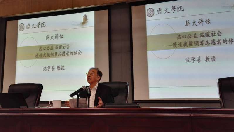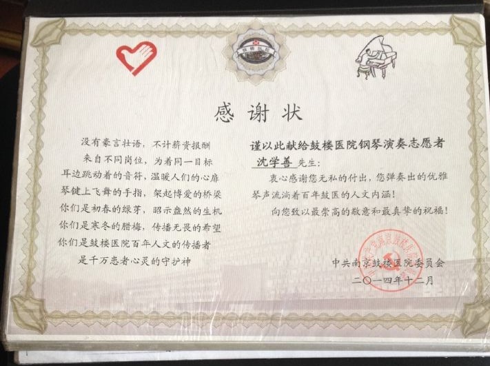 离休后,沈学善开始在鼓楼医院义务弹钢琴,一弹就是好几年。很多长期住院的病人都很熟悉他,“他的钢琴未必是弹得最好的,但绝对是最用心思的。”原来,沈老常常站在病人们的立场上考虑问题,他觉得病痛中的同志大概会希望听到欢快的、正能量的音乐,于是他专挑气势昂扬的曲目弹,他弹奏的《我的祖国》就总是受到好评。想到大家听了能高兴,沈老觉得一切辛苦都值了。沈老从小学风琴,有良好的音乐基础。90年代,南大成立钢琴进修班,他参加了第一届培训,也买了第一架钢琴。