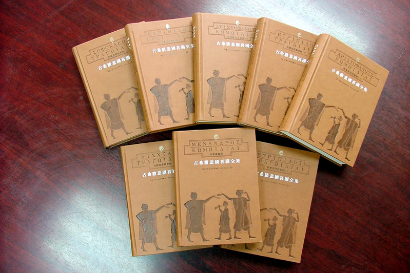 最近,张先生有了一声“于无声处听惊雷”般的响动。他来电话告诉我,由他主译的《古希腊悲剧喜剧全集》刚刚在译林出版社出版。全书共有八卷,300余万字,由他独立翻译的有六卷,其余两卷是中国社科院外国文学研究所的王焕生研究员译出。接着的好消息是他分到三套作者样书,可以送我一套。我急急得令赶到他府上,看到了这一凝聚了他十年心血的成果。这套书可算是开了国内图书设计的先河,外壳为精美皮面包装,封面上烫出古希腊演剧场景,典雅庄重。这只是外表,而内里就更了不得。该套书包括埃斯库罗斯、索福克勒斯和欧里庇德斯的悲剧以及阿里斯托芬和米南德的喜剧,涵盖了古希腊所有存世悲剧作品32部和所有存世喜剧、新喜剧作品18部,最为齐全周详。尤为难得的是,全部译作都是从古希腊原文直接译出,不经其他外国文转译,以求最大限度地忠实原作,让国内读者享受原汁原味的西洋古典文化之美。