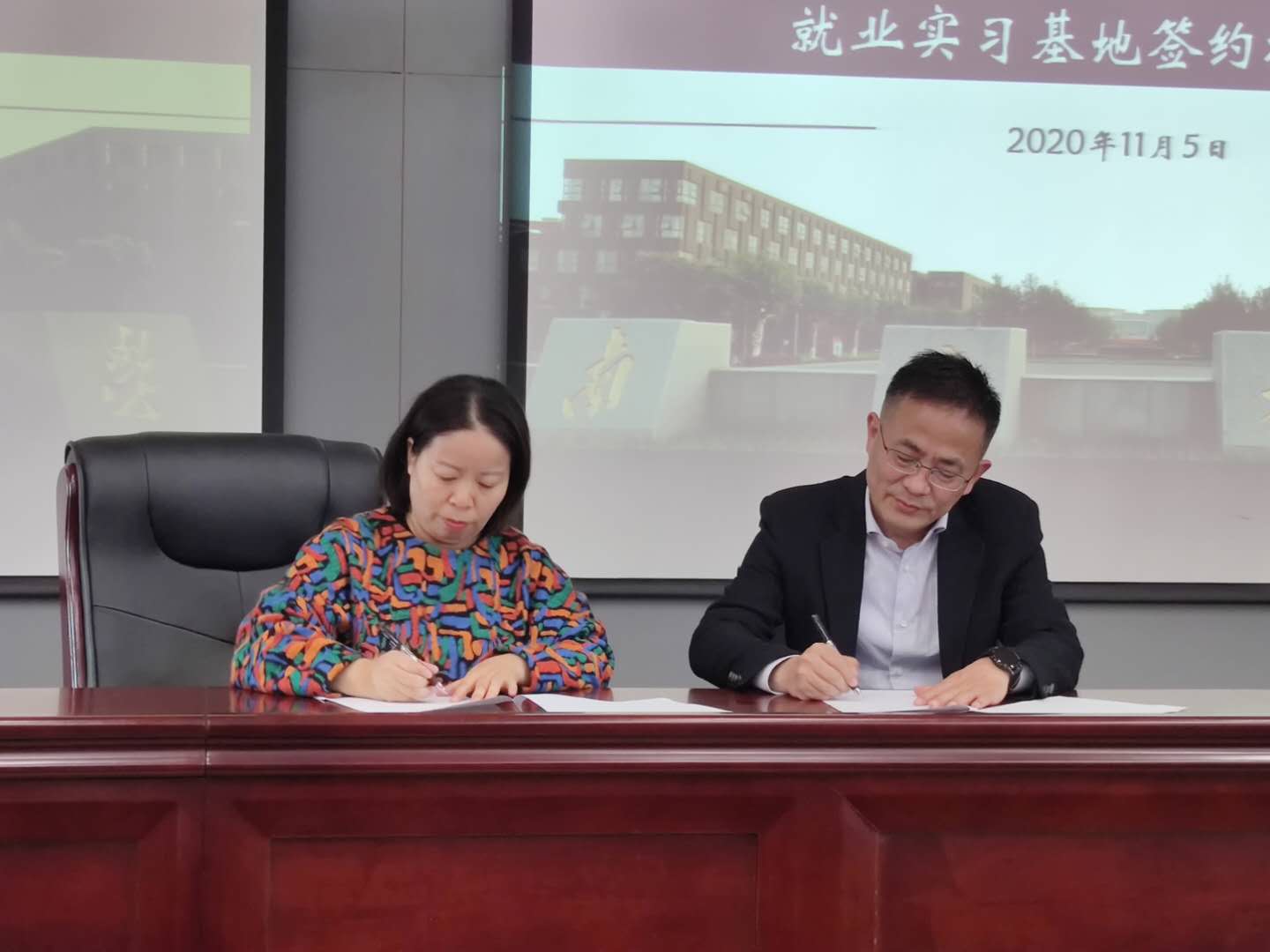接下来,学院党委副书记任玲玲与《培训》杂志主编朱伟正校友签约并进行就业实习基地授牌仪式。