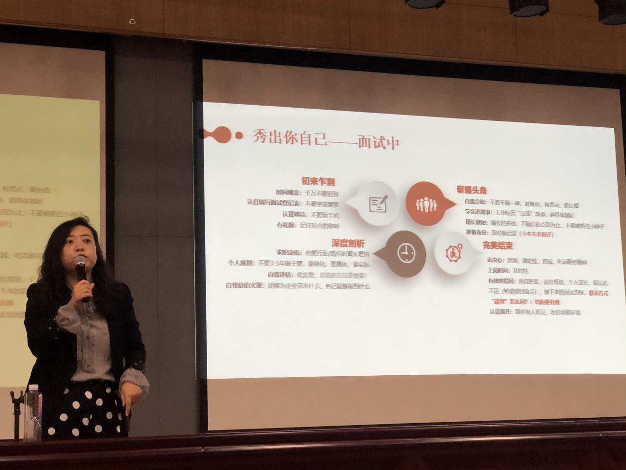 最后,《培训》杂志人力资源部经理周晋为在场同学进行了题为“职场启航——面试与求职那些事儿”的培训。周经理指出,“先择业再就业”是求职的最佳路径;同时她还强调,择业方向尤为重要,需要全面考虑个人兴趣、市场趋势、自身实力、家庭、工作区域等因素,并要懂得使用各种求职软件。另外,培训还就简历制作、面试技巧、求职细节把控等方面对在场同学进行了指导。