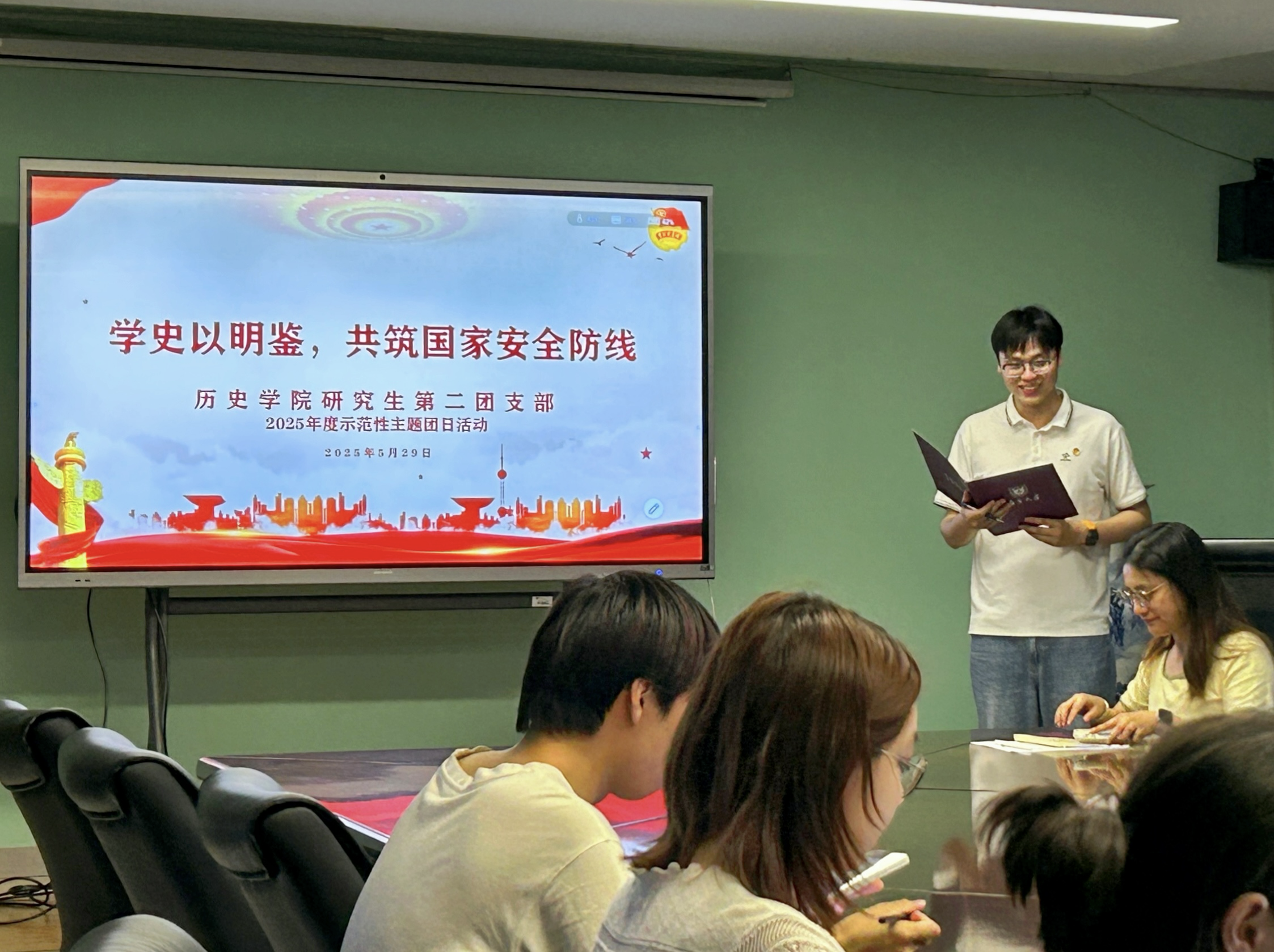 为深入贯彻落实习近平总书记关于加强国家安全教育的重要指示批示精神,贯彻落实总体国家安全观,积极响应“全民国家安全教育,走深走实十周年”宣传主题,提升青年学子的国家安全意识,践行青年责任与担当,5月29日晚,av片 研究生第二团支部于大美楼223会议室开展“学史以明鉴,共筑国家安全防线”主题示范性团日活动。av片 团委副书记、研究生辅导员王恩惠出席,活动由研究生第二团支部团支书、2024级硕士研究生苏豪主持。