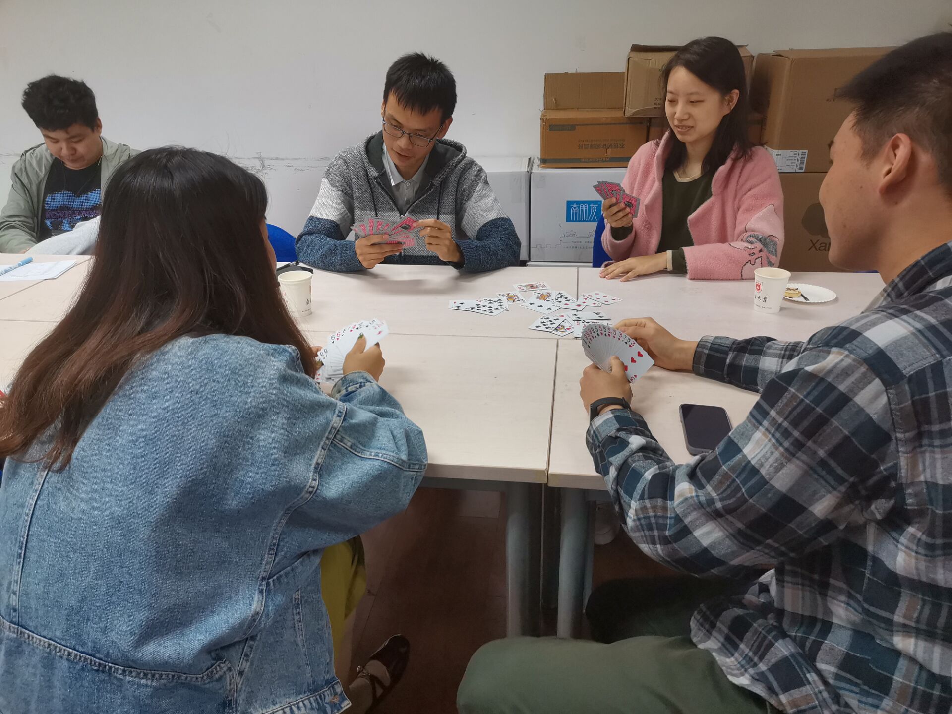 晚上的UNO桌游活动依旧激动人心,六组选手同时比拼,初赛三轮中的每一组第一晋级决赛。“UNO”的呼喊混合着“浅摸X张”的嬉笑,活动室里一派欢乐的气氛。相互“坑害”之下,原本陌生的同学迅速熟络,友谊在你来我往的“加牌”间不断升温。在欢声笑语中,一天的联谊活动也悄然落下帷幕。