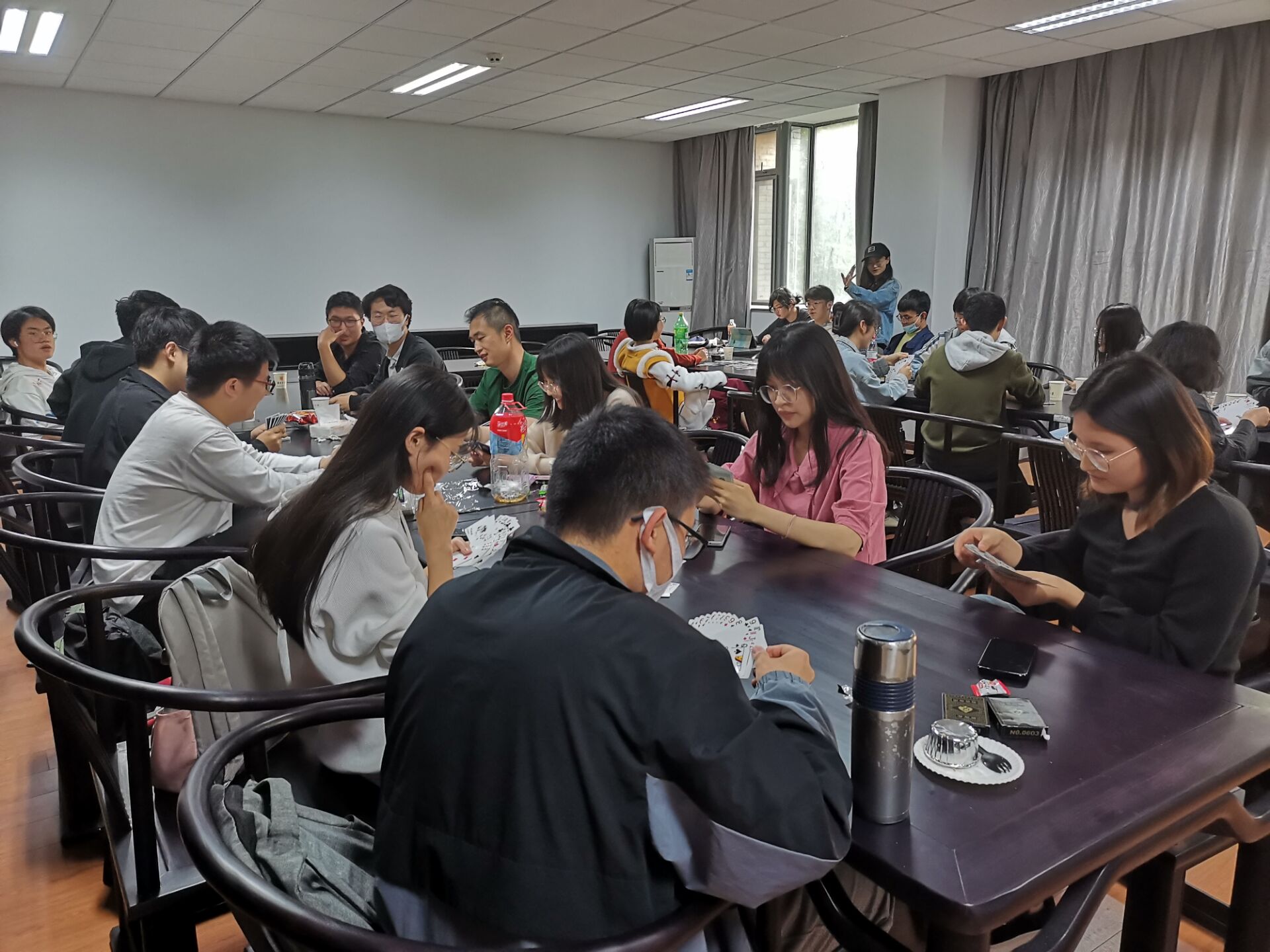 与王者荣耀争霸赛连场进行的是掼蛋比赛。在享用丰盛的茶歇后,选手们依序落座,根据抽签匹配对手。掼蛋比赛以个人积分形式排名,不论是老手新手,都很快投入到激烈的战局中。学习之余难得闲暇,大家在棋牌博弈之中,享受这美好的夏日午后。