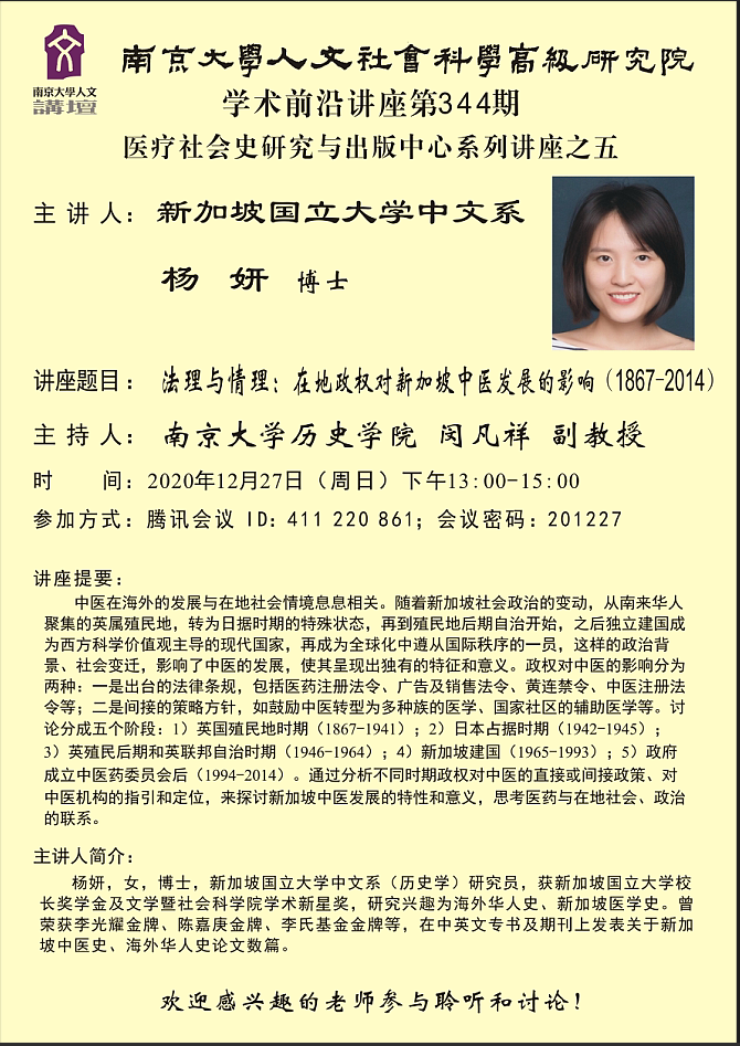 讲座预告 | 法理与情理:在地政权对新加坡中医发展的影响(1867-2014)
